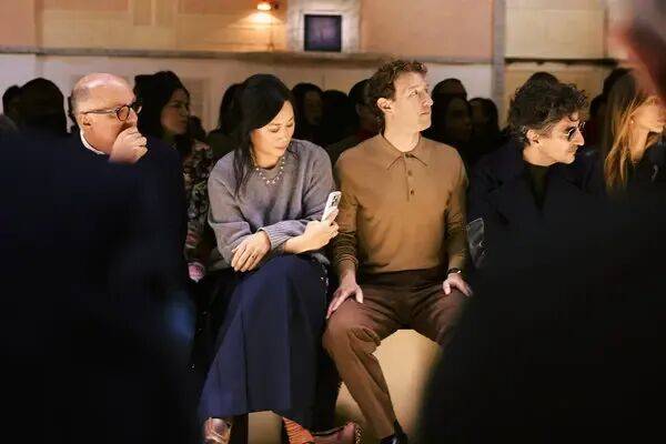 看秀时,扎克伯格换上笔直坐姿,比上听证会还认真。更逗的是普利希拉还给老公讲解T台上的叠穿细节,像极了“老婆带老公逛街买衣服”,两人脚上还穿了同款情侣Prada乐福鞋。