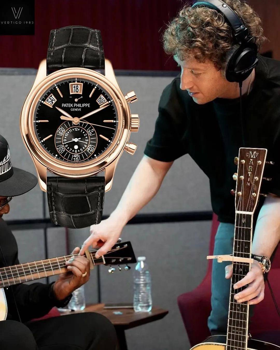 而和美国歌手T-Pain合作做音乐时,腕上又赫然出现一枚百达翡丽5961R年历计时码表,还是已经停产的表款,依然是黑金配色+复杂功能,每一块都让资深表迷垂涎不已。