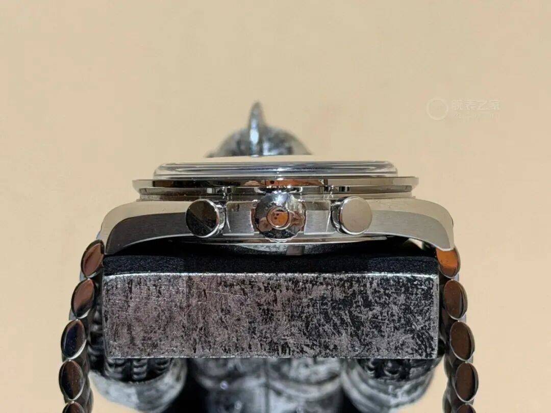 表盘是这款腕表的一大亮点,传承了超霸标志性的“阶梯式”设计,同时采用双层盘面结构,质感十足。上层黑色表盘经过抛光和漆面处理,光泽感出众,还配有镀铑小表盘外框;底层白色小表盘同样做了漆面处理。黑色主表盘搭配白色分钟圈,白色小表盘搭配黑色刻度,黑白分明的反转设计,不仅好看,还大大提升了读时便捷性。