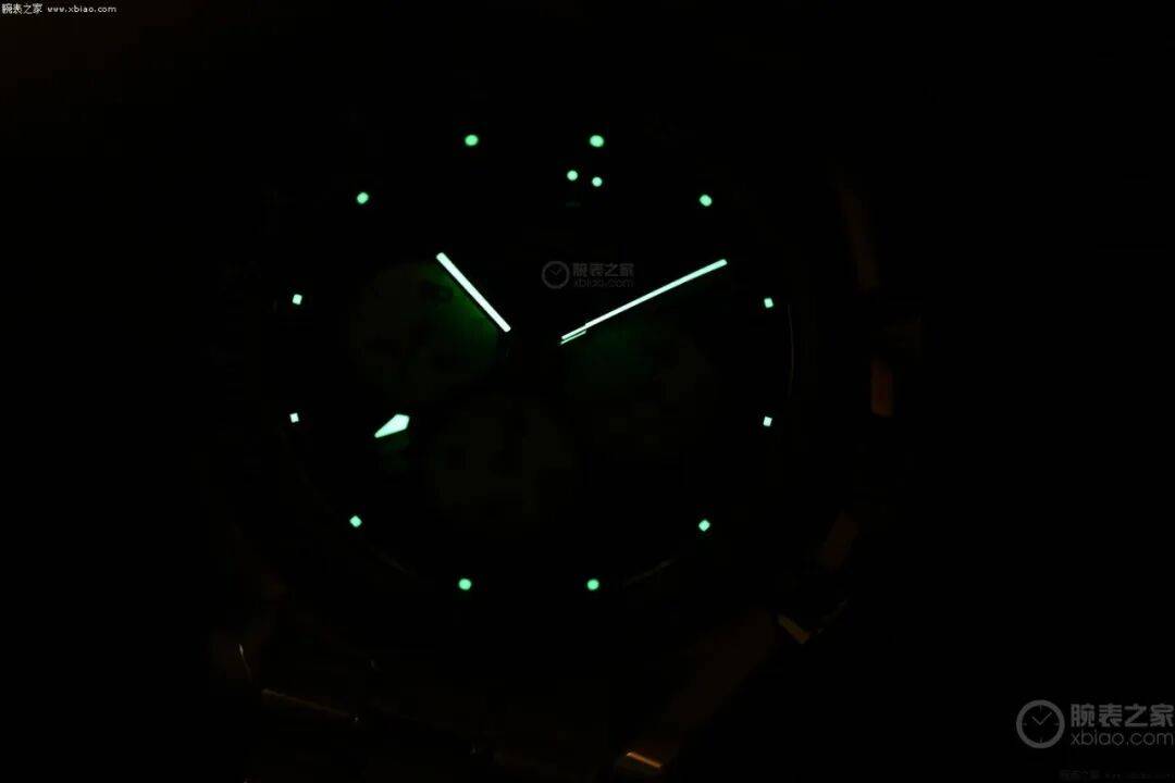 腕表的指针和小时刻度都采用了镀铑工艺处理,质感细腻,还覆盖了白色Super-LumiNova夜光涂层,夜间读时毫无压力。