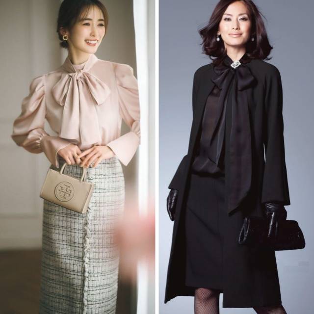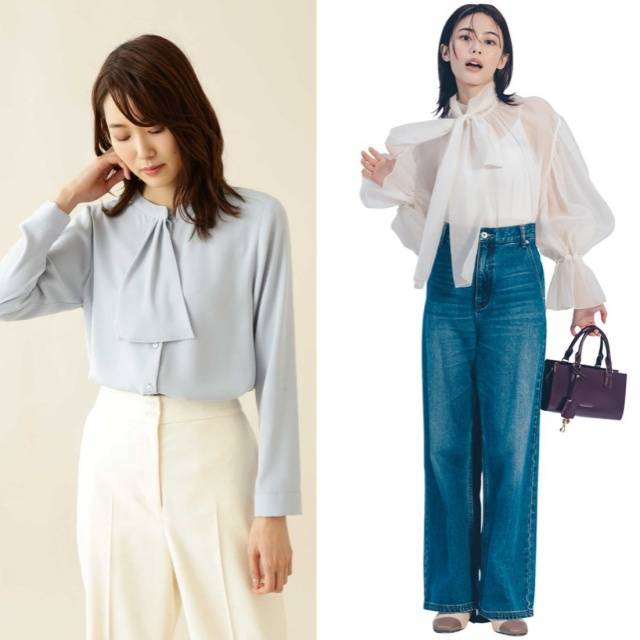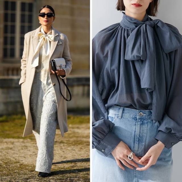 灰色半透明蝴蝶结🎀衬衫,搭配黑色『高腰阔腿裤』。以柔和的色调与质感打造女性♀️化衬衫,再用廓形感十足的裤子增添干练气质。虽然蝴蝶结🎀较大,但因色彩沉稳,避免了过于柔弱的感觉。蓬松的衬衫与阔腿裤的宽松线条,在简约之中流露出优雅气息。