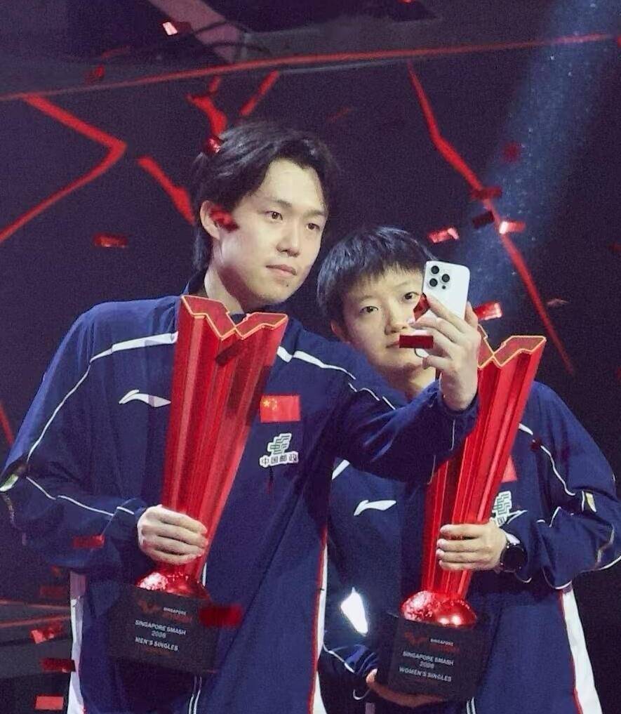 按照WTT大满贯赛事的惯例,单打冠军需要为举办城市拍摄宣传照片。 这次的地点选在了新加坡的海洋馆,具体拍摄区域在鲨鱼馆。 在颁奖仪式结束后,孙颖莎和王楚钦前往海洋馆完成了这项冠军任务。 队友牛冠凯在『社交媒体』上提前曝光了一张后台合影,照片中他和王楚钦站在海洋馆巨大的观景玻璃前,幽蓝的水光映在脸上。 虽然正式的官方宣传照尚未发布,但“莎头组合在海洋馆拍冠军照”的消息已经让球迷们期待不已。