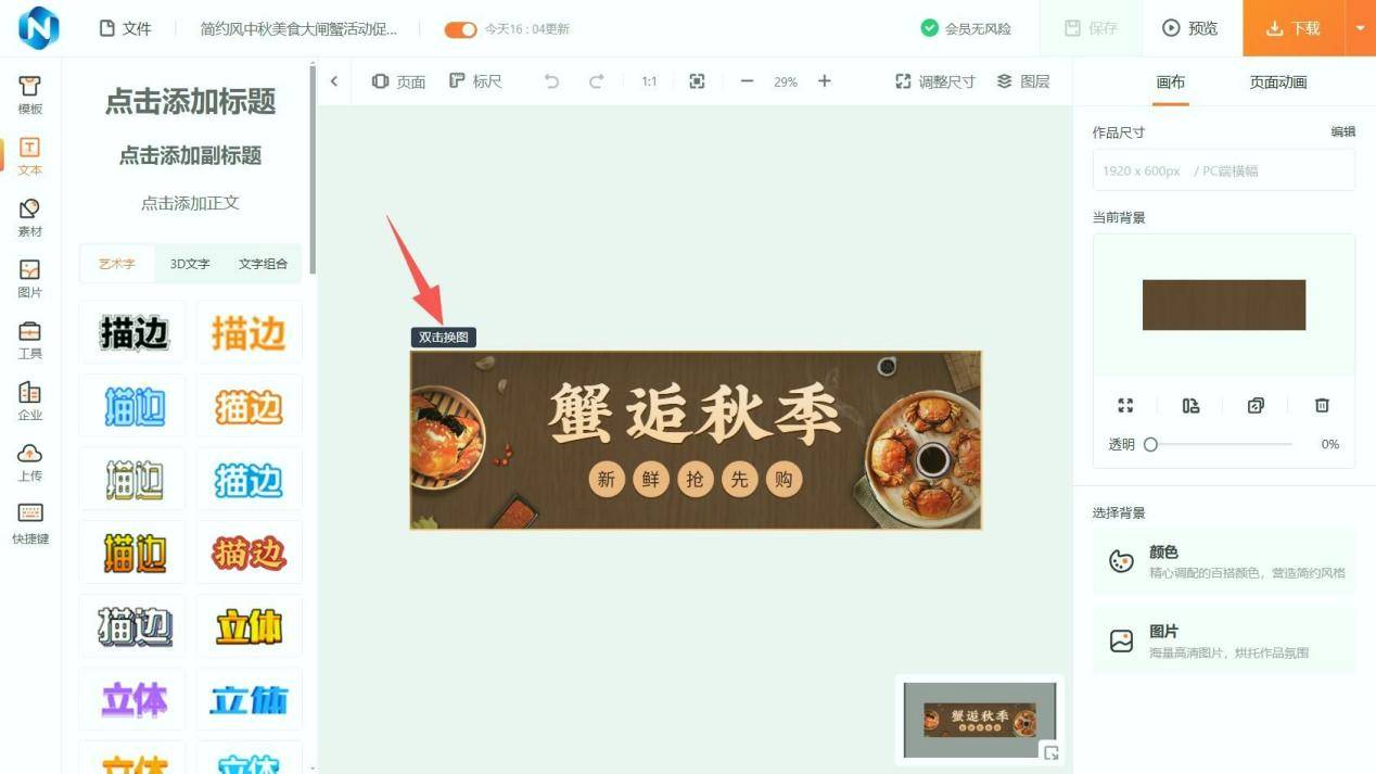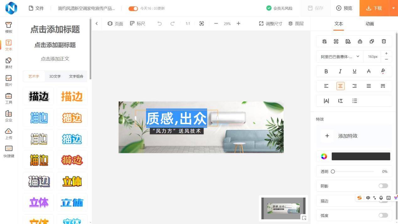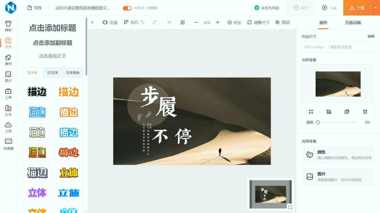 基础免费素材数量较多,以简约风图片和模板为主,适合日常宣传、基础电商设计等场景。支持简单的在线编辑和免费下载,操作步骤简单,上手难度低。进阶素材收费中等,但优质素材数量相对较少,更新速度一般,且部分素材商用需额外付费,存在隐性成本。