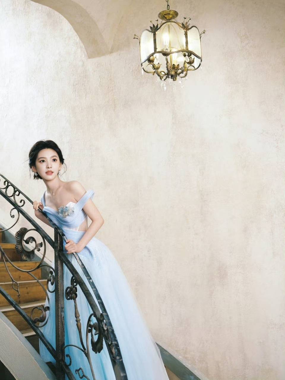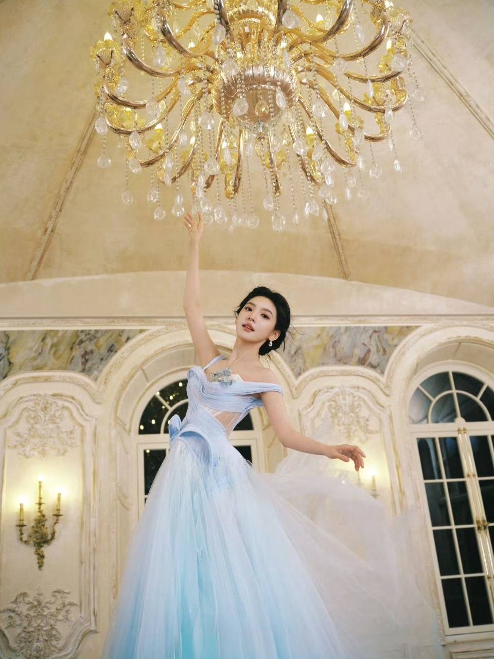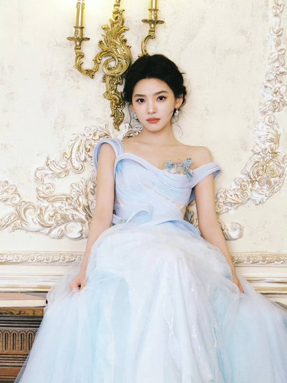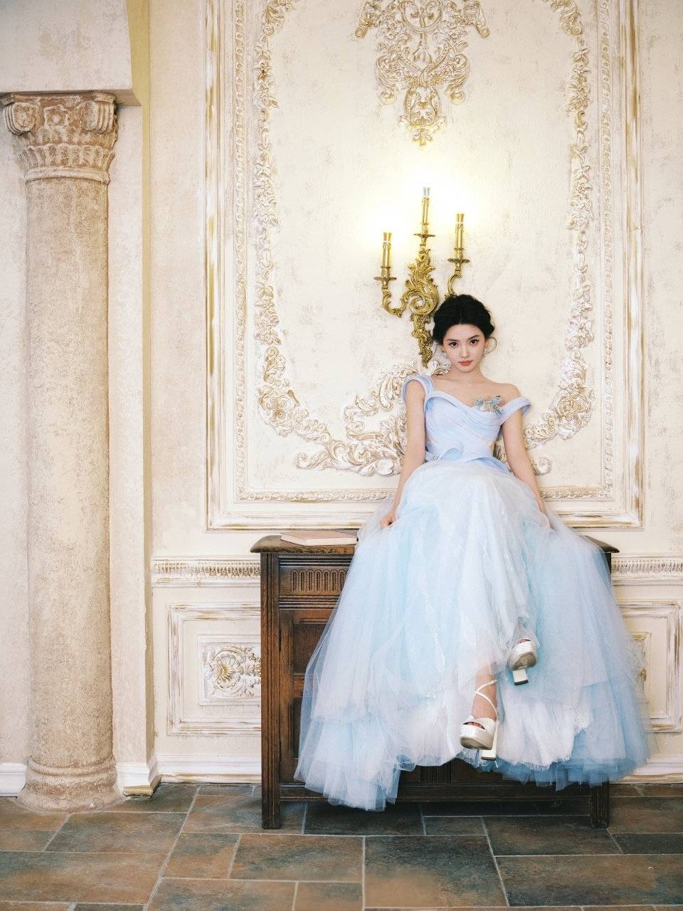 造型的惊艳感,藏在每一处细节里。金鹤龙摒弃了浓重的眼影与修容,转而用清透底妆打造“肌肤胜雪”的质感,眉眼间仅用浅灰色眼影勾勒出疏离感,唇色则选用透红的玉髓色,似有若无的色彩让整体『妆容』充满易碎感。更绝的是服装搭配:一袭粉彩蓝礼服如月光倾泻,与『妆容』形成冷暖交织的视觉冲击,连章若楠耳垂上那对珍珠耳钉,都被网友解读为“古堡公主的封印”。