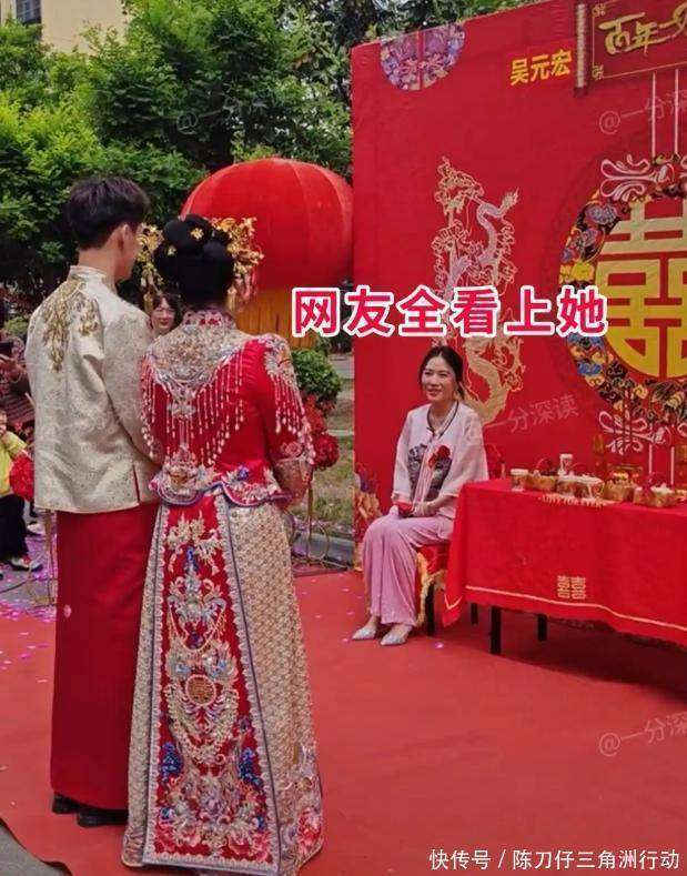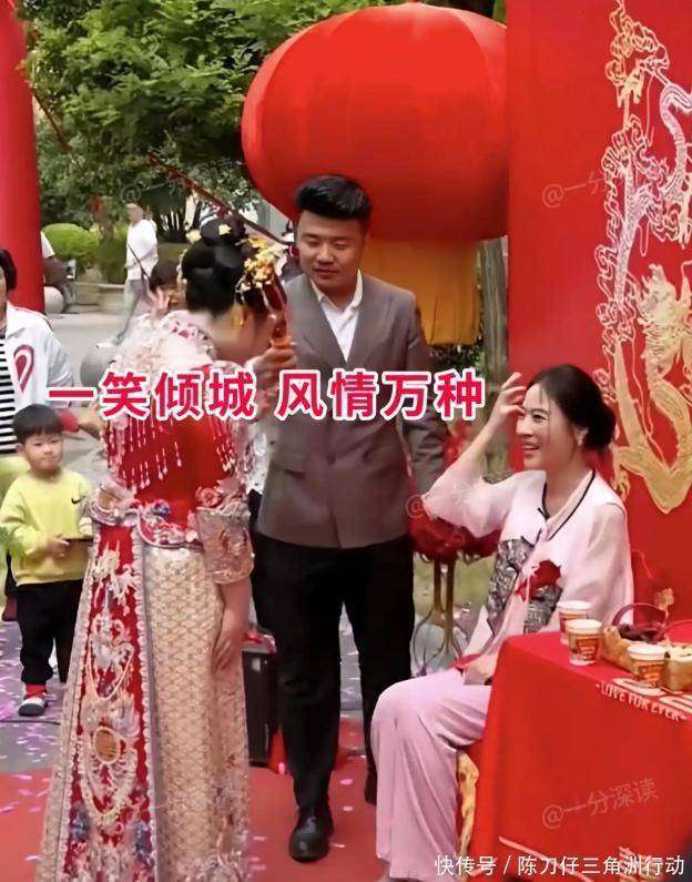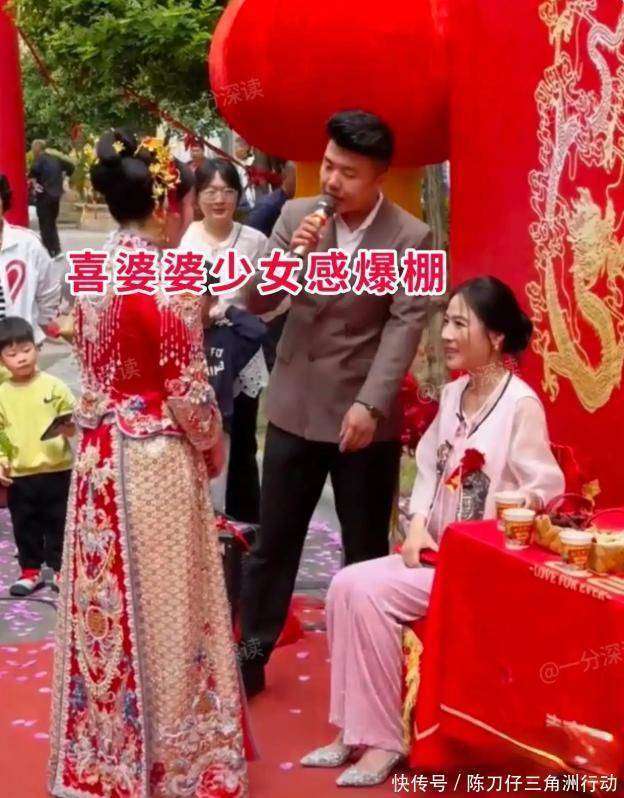 尽管已经是中年人,她的外貌却让人觉得她似乎依然停留在二十多岁。那清澈的眼神,仿佛是一位十八岁少女的眼神。她坐在椅子上,等待着儿媳敬茶,整个场景弥漫着一种岁月静好的气息。不得不说,确实是有对比才有伤害,新娘在这一刻的表现相对逊色。虽然她穿着精致的秀禾服,但她的身形稍显丰满,面容也只能算是普通。更重要的是,作为新娘,应该是婚礼中最耀眼的人物,但她一直垮着脸,或许因为婆婆的美丽和气质,令她有些不快,心情显然并不愉悦。幸运的是,喜婆婆并没有因此受到影响,她的脸上始终带着微笑。由于喜婆婆美得如此耀眼,摄影师似乎被她吸引住了,整个婚礼过程中,镜头几乎没有离开她,而新娘却几乎没有一个正面镜头。