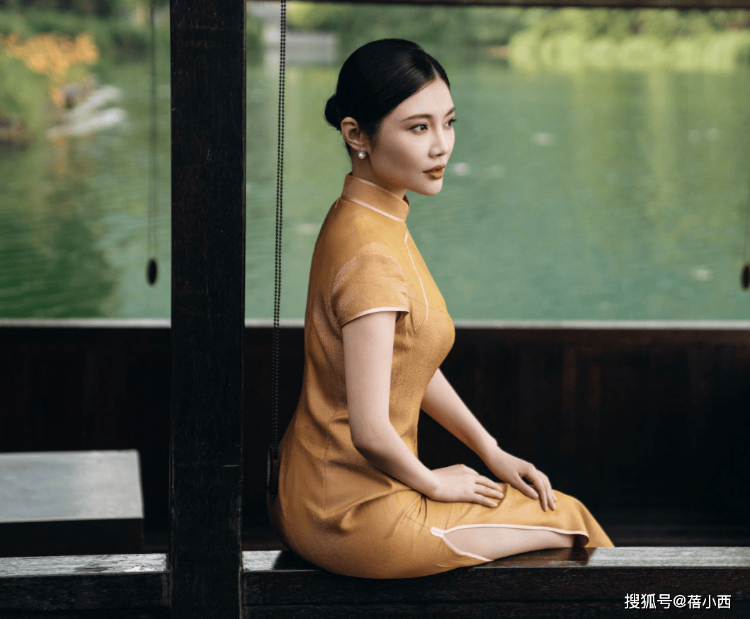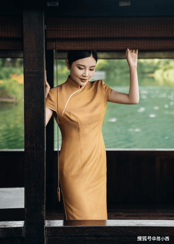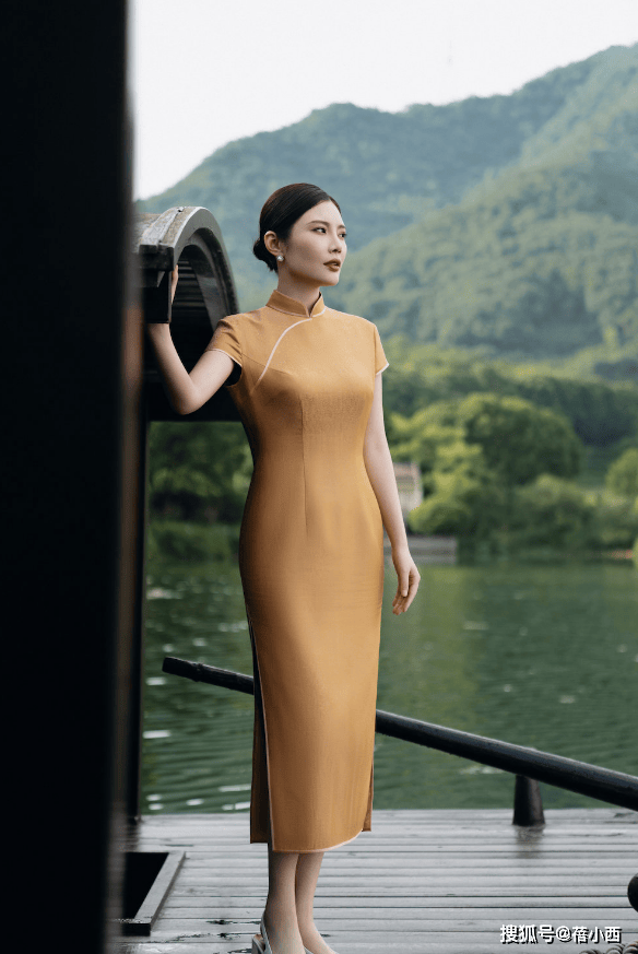 而另一套姜黄色旗袍造型,则完全是另一种风格,从复古娇俏转向了东方温婉,这条姜黄色旗袍选用了质感细腻的面料,在光线下泛着柔和的光泽,再看剪裁,高领设计贴合颈部,保留了传统旗袍的端庄,短袖的长度恰到好处,露出了她纤细的手腕,弱化了手臂的线条感,而最惊艳的是修身的版型,从肩部到腰腹再到臀部,每一处都精准贴合她的曲线,没有一丝多余的赘肉感,反而显得婀娜多姿。