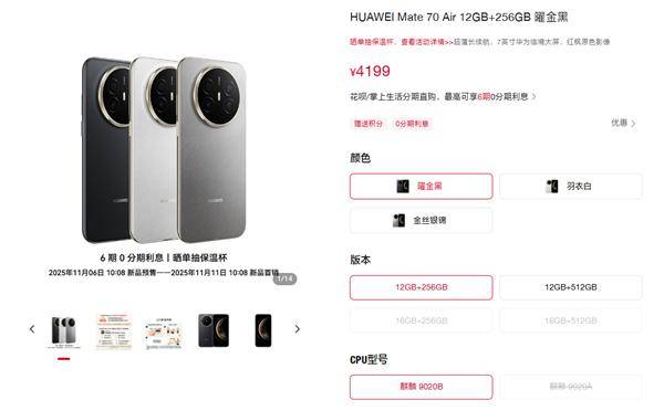 站长之家(ChinaZ.com) 11月6日 消息:今日10:08,华为Mate70Air正式开启预售,目前该机已在华为商城上架,并且直接公布了具体价格与详细配置,引发了市场的广泛关注。此次华为Mate70Air的一大亮点在于首次提供了可选的麒麟CPU版本,为消费者带来了麒麟9020B和麒麟9020A两款选择。