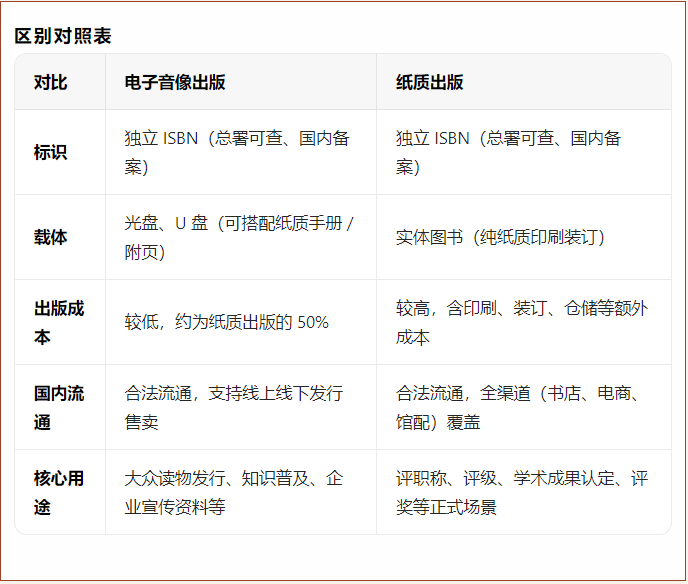 很多作者老师会混淆电子音像号与纸质书号,主要疑问就是“能不能在国内流通”和“用途适配性”上——其实这两者都是总署备案的合法出版形式,关键就是在于载体、成本和适用场景上。