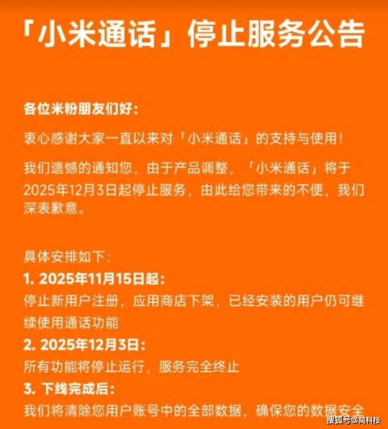 原来这都是“小米通话”要停服闹的,目前小米通话发布公告称,因产品调整,11 月 15 日起将从应用商店下架,停止新用户注册,已安装的用户可使用至 12 月 3 日,之后将会停止服务,同时清除用户数据。