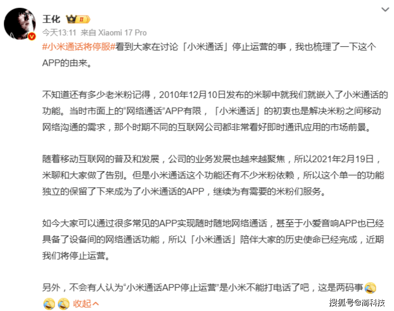 王化表示,“小米通话App停止运营”并不意味着小米手机不能打电话,这完全是两码事,大家不要弄混了!