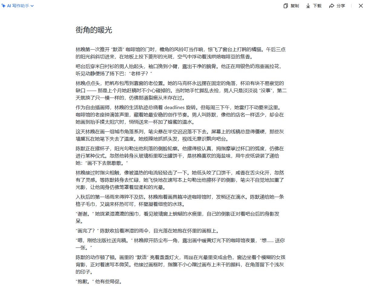 有次我想试试写甜文,就丢给它一个插画师和咖啡店老板的设定,出来的故事温柔又流畅。我朋友看完直接问我:“你什么时候文笔变这么细腻了?”像短篇轻松小品、日常向故事,用它就够。