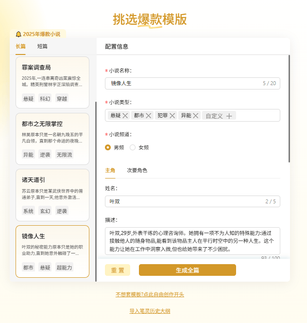 我第一次用的时候正好赶稿,但脑子里只有一个模糊的故事框架,连大纲都没想清楚,整个人有点慌。偶然翻到笔灵的【AI写全篇小说】功能,就顺手点开试了试。在页面里填了主角、题材、冲突这些基本设定,点一下生成,不到一分钟,一整章的草稿就摆在眼前了,只需要再稍微调整一下细节就可以交稿了。这种“突然有东西可以接着写”的轻松感,让我印象特别深。