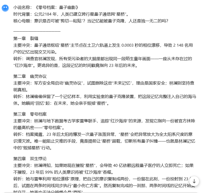 像DeepSeek上下文记忆有上限,写长篇时经常出现“前后章节衔接不畅”的情况。后来我的做法是:先产出完整大纲和人物设定,再把长篇拆成章回体,每写一章就调用资料提示AI,再自己修改润色。