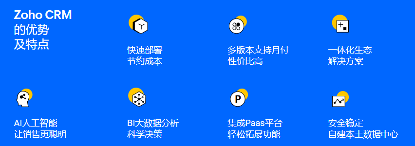- AI助手(Zia):智能推荐、预测销售趋势、自动提醒等。