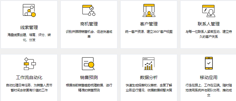- 销售自动化:包括潜在客户管理、机会管理、任务和活动跟踪、销售预测等。