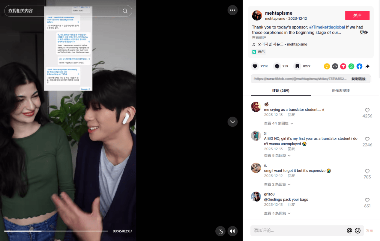 拥有39.44万粉丝的韩国、土耳其跨国情侣账号@mehtapisme,就为Timekettle品牌拍摄了一条展示双方借助翻译耳机实现无障碍沟通的视频,引发了众多异国生活用户的共鸣,收获了超7万的点赞。