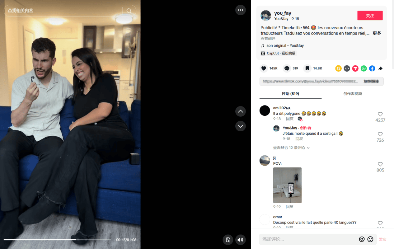 为了创新形式,增加新鲜感和趣味性,Timekettle还同拥有270万粉丝的TikTok搞笑夫妻账号@you_fay进行了合作,以“让丈夫相信我能说40种语言”为主题创作了情景短剧。