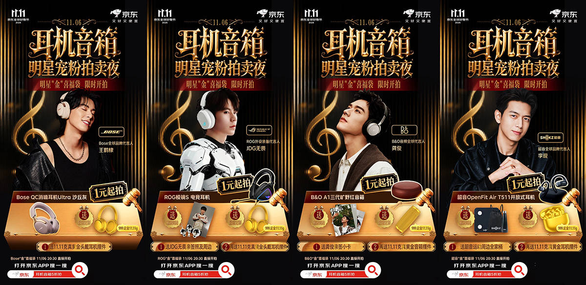 此外,11月6日20:30还将重磅上线明星宠粉拍卖夜活动,明星“金”喜福袋限时1元起拍。王鹤棣代言的Bose QC消噪耳机Ultra、ROG与JDG联名棱镜S电竞耳机、龚俊代言B&O A1音箱、李现代言的韶音OpenFit Air耳机等多个明星同款福袋参与竞拍,每个福袋均含11.11克999足金定制摆件,部分福袋更附赠明星亲签等稀缺周边。此外,还有梁靖崑、任贤齐、周传雄等多位明星代言的产品福袋参与竞拍,1元起即可集齐收藏与聆听的双重体验。