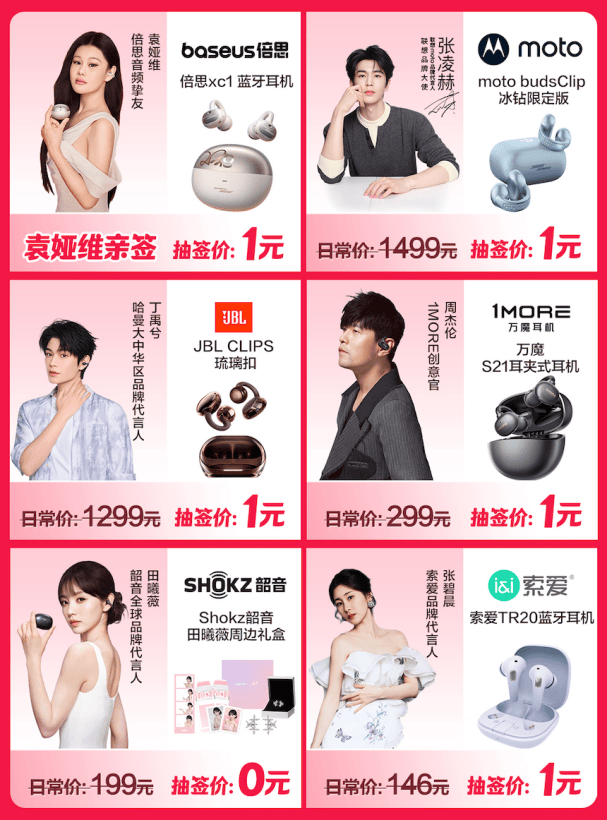 产品阵容诚意十足,涵盖不同价位与类型的明星同款。张凌赫同款moto budsClip冰钻限定版与丁禹兮推荐的JBL CLIPS琉璃扣,均为市场价千元级明星产品,本次1元可抽;周杰伦力荐的万魔S21耳夹耳机与张碧晨代言的索爱TR20蓝牙耳机也加入抽签行列,主打高性价比与实用体验;更有机会1元抽取倍思xc1蓝牙耳机袁娅维亲签版、0元抽取田曦薇专属韶音周边礼盒福利,为粉丝带来多重惊喜。