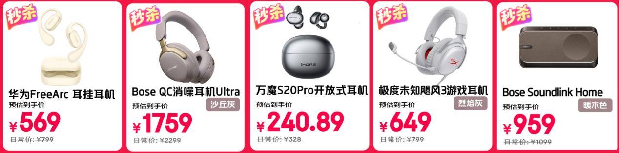 本次宠粉周在11月6日推出爆款秒杀专场,精选多品类设备,以极具竞争力的价格覆盖各类使用场景。华为FreeArc耳挂耳机与万魔S20Pro开放式耳机专为运动通勤设计,兼顾舒适与稳固;BoseQC消噪耳机与Bose Soundlink Home音箱则共同致力于提升聆听体验,带来沉浸音效;还有极度未知飓风3游戏耳机专为玩家打造,提供精准声场定位。多款设备同步秒杀,价格优势显著,是升级听觉装备的绝佳时机。