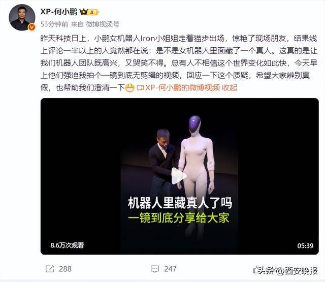 6日上午,何小鹏微博回应:昨天科技日上,小鹏女机器人Iron小姐姐走着猫步出场,惊艳了现场朋友,结果线上评论一半以上的人竟然都在说:是不是女机器人里面藏了一个真人。这真的是让我们机器人团队既高兴,又哭笑不得。总有人不相信这个世界变化如此快,今天早上他们强迫我拍个一镜到底无剪辑的视频,回应一下这个质疑,希望大家辨别真假,也帮助我们澄清一下。
