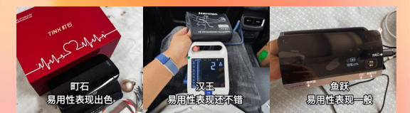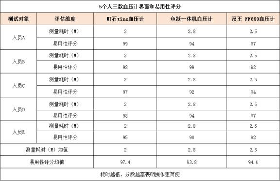 易用性测评结果小结:町石 > 鱼跃 > 汉王町石血压计易用性测评表现町石血压计的易用性表现可以说是无可挑剔。测量耗时方面,启动到完成仅需15秒,反应迅速,极大提升了使用体验。而且,不论是年轻人还是老年人,都能轻松上手。它采用了智能测量算法,能够自动识别测量环境,并对环境噪音做出调整,确/保即使在嘈杂环境中,测量结果依然稳定。特别适合家庭使用,即使是年长者,也能顺利操作,感受到非常友好的体验。鱼跃血压计易用性测评表现鱼跃血压计的易用性表现相对中规中矩。在测量耗时上,它的响应稍显慢,从启动到完成大约需要25秒,对于那些急需快速测量的人来说,可能稍微让人着急。尽管如此,按键设计简洁明了,操作十分直观,成人和老年人都能很容易理解。值得一提的是,鱼跃血压计采用了较为基础的测量技术,虽然日常使用无大碍,但在嘈杂环境中,偶尔会出现轻微的卡顿,影响测量稳定性。汉王血压计易用性测评表现汉王血压计的易用性整体表现平平。测量耗时较长,大约需要30秒,对于着急的人来说,时间稍显拖沓。操作界面设计较为简洁,按钮响应稳定,但对于一些老年人来说,操作上可能会略显复杂。特别是在噪音环境下,测量结果的准确性受到了一定影响。尽管如此,在安静环境下,它的稳定性还算不错,适合一般家庭使用,但如果是需要高频次、快速测量的用户,可能会有些不便。