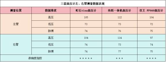 测评方法:通过测量不同位置(左臂、右臂),然后对比高压、低压、脉搏数值结果。