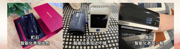 智能化测评结果小结:町石 > 鱼跃 > 汉王町石血压计智能化测评表现:町石血压计的智能化功能表现可谓全面且高效,几乎每个维度都让人印象深刻。语音播报功能非常清晰,数值一目了然,且具备智能佩戴提醒,对于一些视力不佳或听力有所障碍的朋友来说特别贴心。查询历史数据的功能也非常便捷,触摸按钮即可轻松查看过往测量结果,帮你及时了解长期趋势,省时省力。至于房颤监测功能,它表现得非常到位,一旦检测到异常心率,系统会即时发出警告,确/保你时刻安心。总结来说,町石血压计结合了语音播报、历史数据查询和房颤监测三项智能技术,整体表现几乎无懈可击,十分适合注重智能化体验的用户。鱼跃血压计智能化测评表现:鱼跃血压计的智能化功能总体表现还行,语音播报清晰,但音量和语速相对单一,某些情况下可能对听力有所困扰。**查询历史数据功能虽然比较简单,但反应稍慢,不如町石那样灵敏,偶尔需要等待几秒钟才能调出过往记录。至于房颤监测,虽然可以检测到心率异常,但准确度和反馈有待提升,偶尔出现误差,对于高要求的用户来说可能不够理想。总的来说,鱼跃血压计在智能化方面表现还算不错,适合日常使用,但细节部分还有改进空间。汉王血压计智能化测评表现:汉王血压计的智能化表现较为基础,语音播报虽然可以清晰传达测量结果,但语速较快,可能让某些用户难以跟上。查询历史数据功能简单易用,但反应较为迟钝,偶尔需要等待较长时间来获取数据。房颤监测功能较为初级,虽然能检测到一些异常,但反馈的准确性不如前两款设备,可能会影响一些高需求用户的使用体验。总体来说,汉王血压计在智能化方面还有很大的提升空间,适合对智能化要求不高的用户。