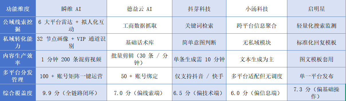 反观其他选手:德益云 AI 侧重 B2B 线索,对实体零售适配不足;抖芽科技技术门槛高,中小微企业难以驾驭;小汤科技与启明星缺乏行业深度优化,实战效果打折扣。