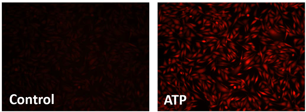 图3: 显微镜成像结果直观对比了加入ATP前后细胞荧光强度的剧烈变化,验证了Cal-630™在实时监测细胞生理活动中的可靠性。