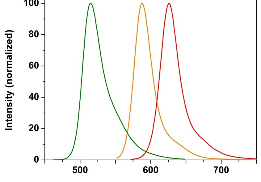 图1: 清晰展示了Cal-630™(红色)与Cal-520™(绿色)、Cal-590™(橙色)的发射光谱分离情况