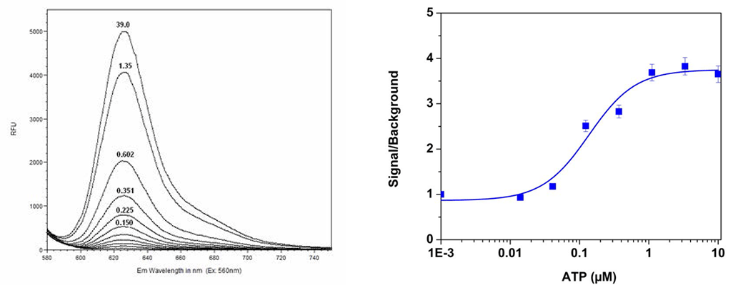 图2: 左图显示Cal-630™在0-39 µM游离钙环境下的荧光发射光谱,证明其出色的钙响应特性;右图在CHO-K1细胞中成功检测到由ATP刺激内源性P2Y受体引发的灵敏、强劲的钙流信号。
