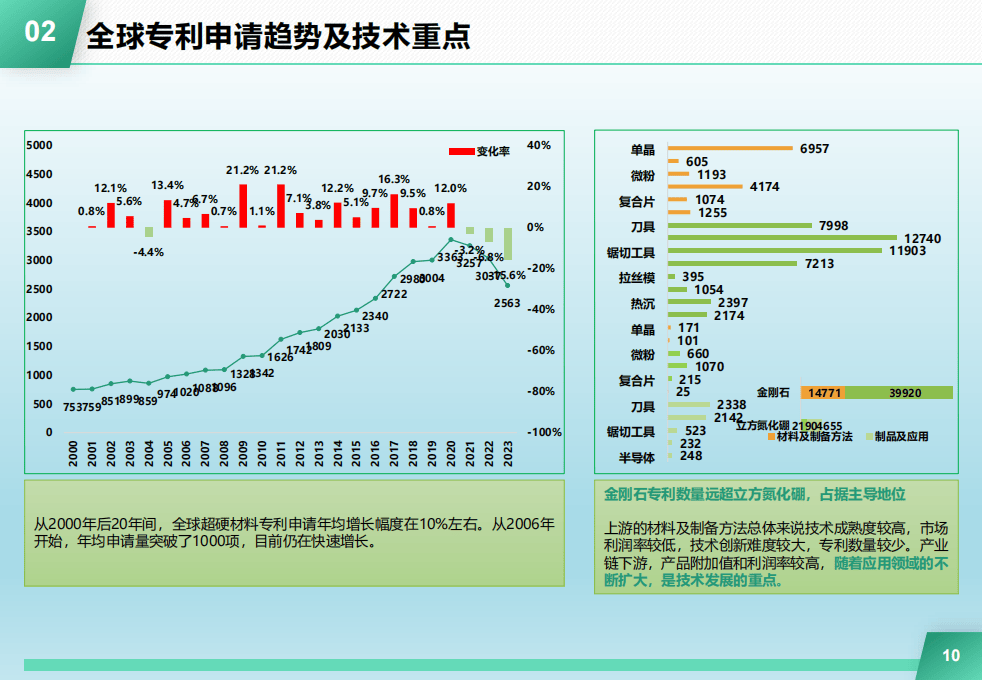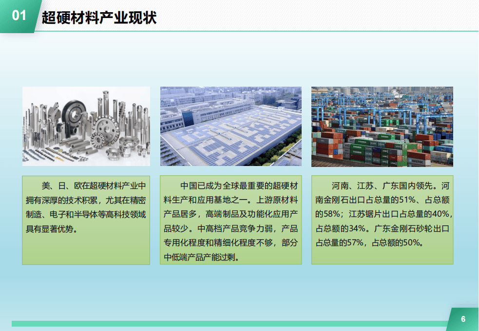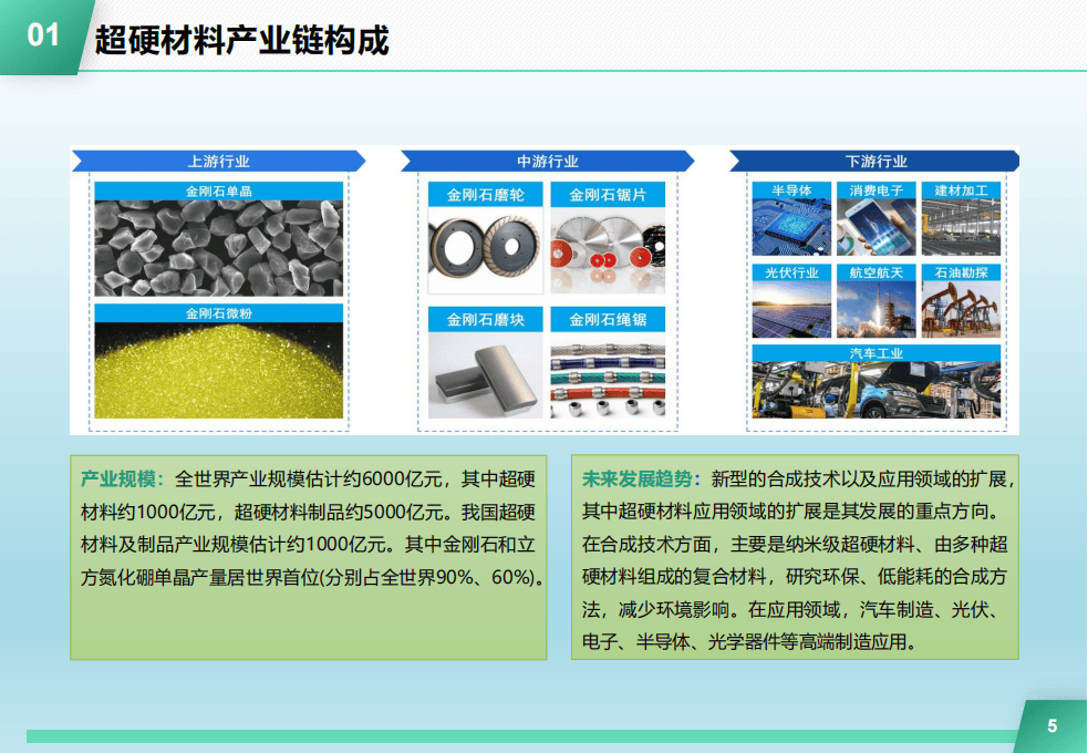 超硬材料产业链涵盖上游原材料、中游制品及下游应用领域,全球产业规模约6000亿元,其中我国产业规模约1000亿元,金刚石和立方氮化硼单晶产量分别占全球90%、60%,稳居世界首位。目前产业呈现“上游基础扎实、下游潜力巨大”的格局,上游材料及制备方法技术成熟但创新难度大,下游制品及应用附加值高、专利布局集中,汽车制造、光伏、半导体等高端应用领域成为发展重点。