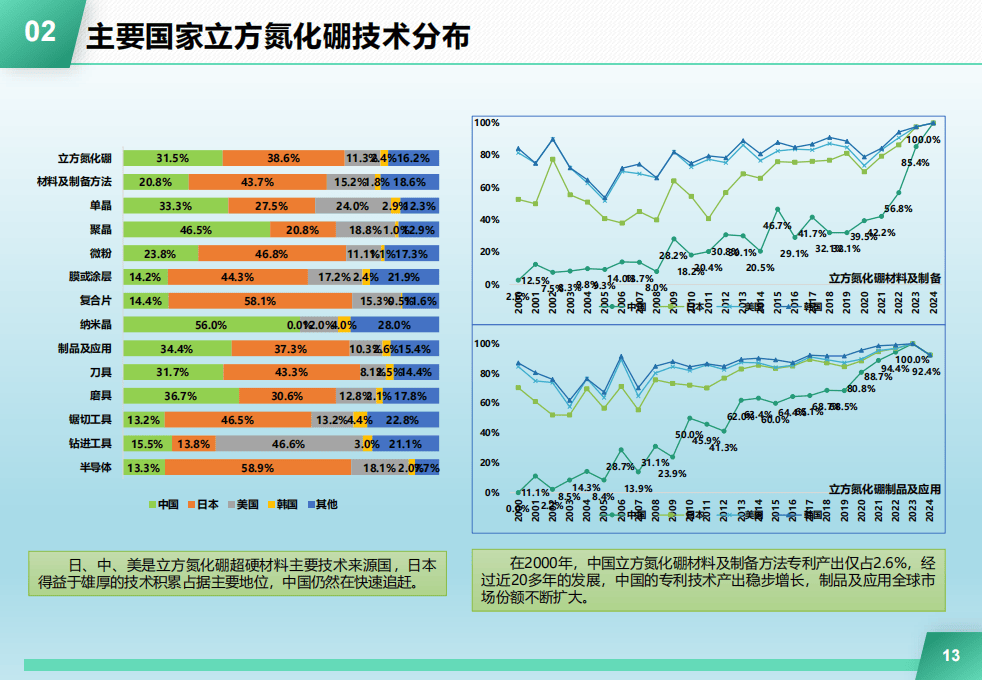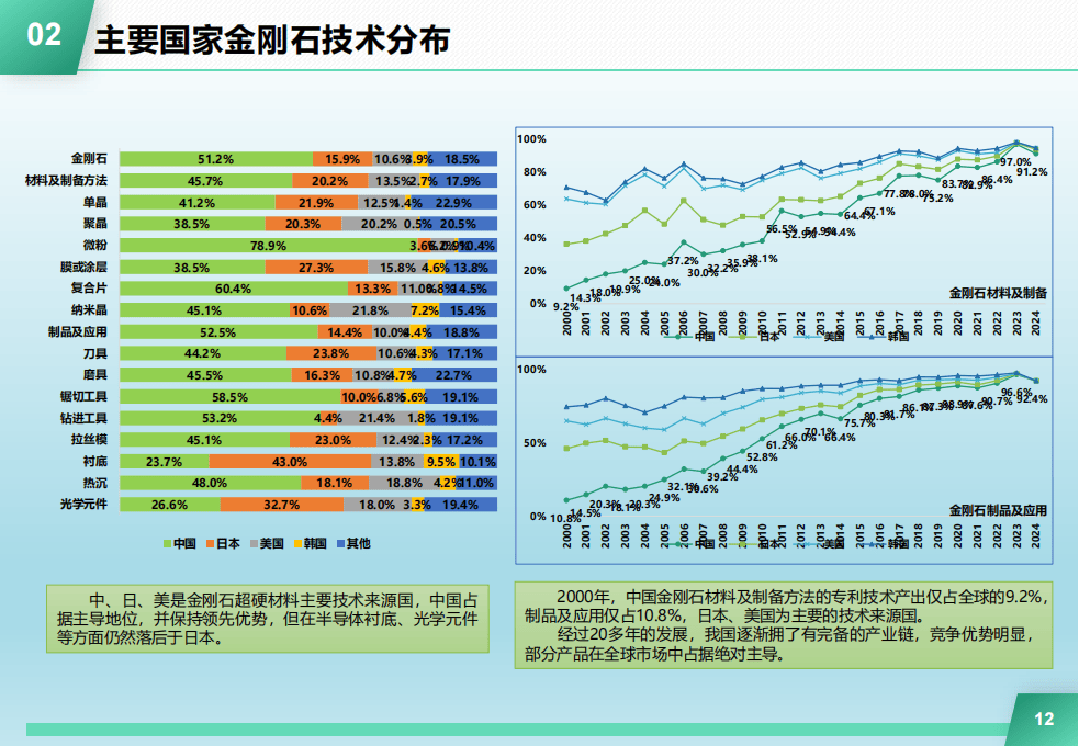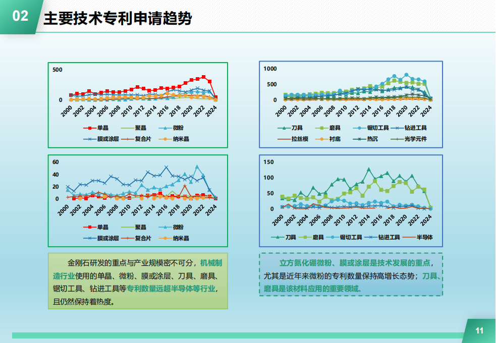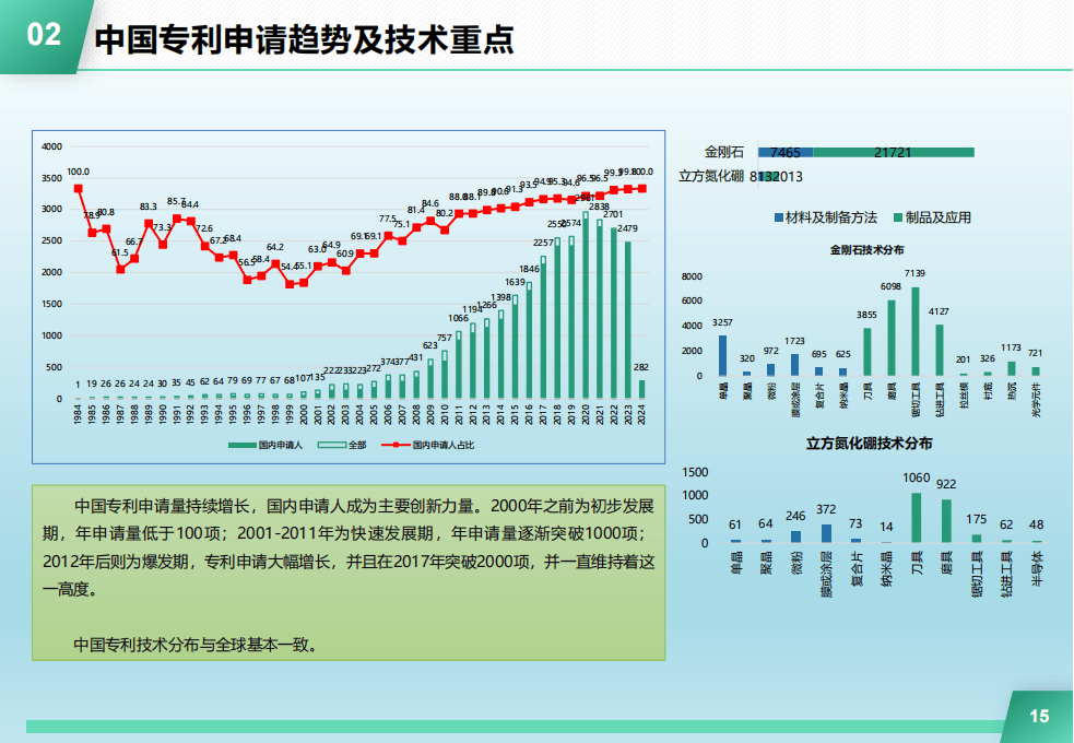全球超硬材料专利申请自2000年后年均增长约10%,2006年起年申请量突破千项并持续增长。金刚石相关专利占据主导地位,远超立方氮化硼;技术热点集中在单晶、微粉、膜或涂层及刀具、磨具等制品。中国已成为全球超硬材料主要技术来源国和生产应用基地,专利申请量持续增长,2012年后进入爆发期,国内申请人占比逐步提升至90%以上,但在半导体衬底、光学元件等高端领域仍落后于日本。
