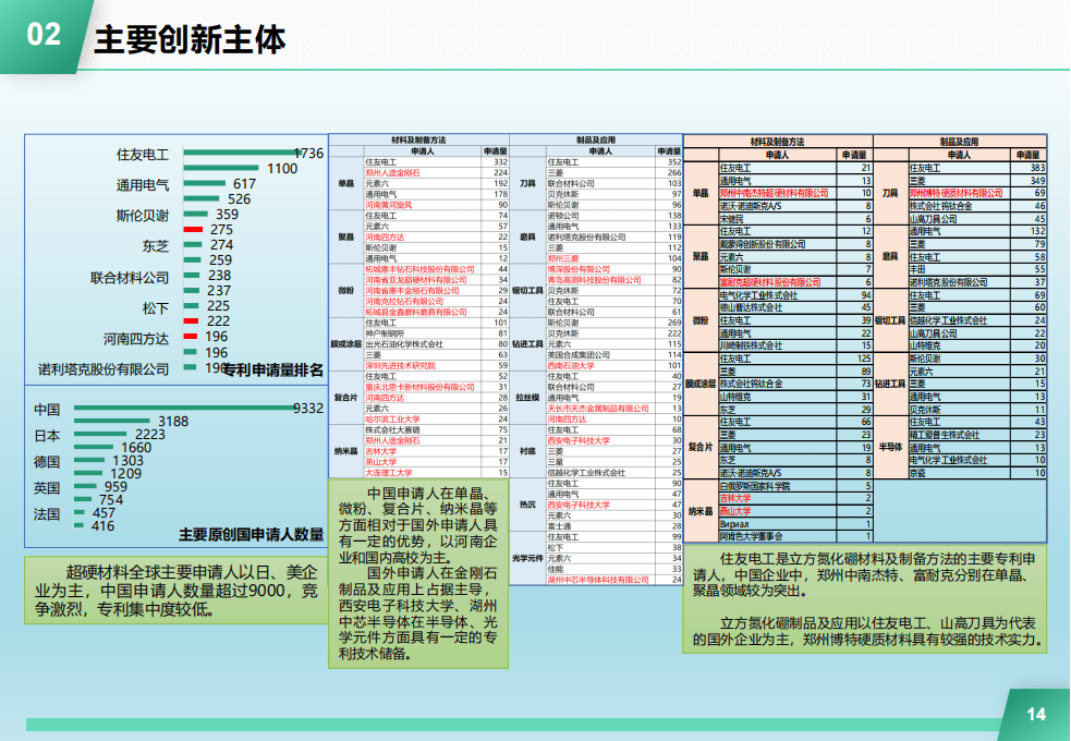 国家层面,中、日、美是主要技术创新主体,住友电工、三菱、通用电气等国外企业在高端制品及应用领域专利布局全面;国内企业以河南、江苏、广东三省为主,河南在单晶、微粉领域优势显著,江苏、广东则在半导体、光学元件等新兴领域快速发力。重庆市在超硬材料领域专利申请量和申请人数量处于全国中下游,需进一步加强产业布局。