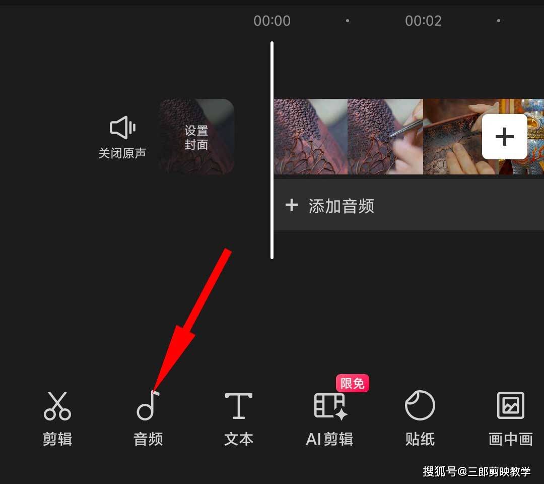 步骤一,不要选中轨道中的任何素材,下方菜单中点【音频】,如下图所示;