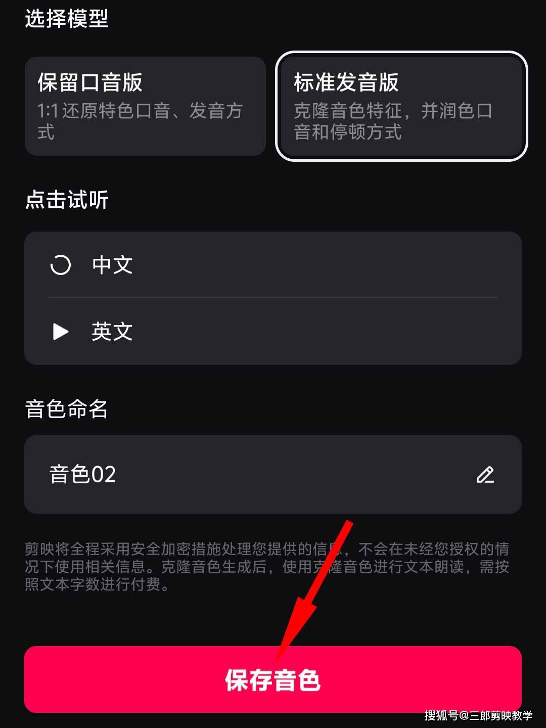 步骤六,给音色名称,如果需要保留特色口音,【选择模型】中点选【保留口音版】,接着点【保存音色】,如下图所示;