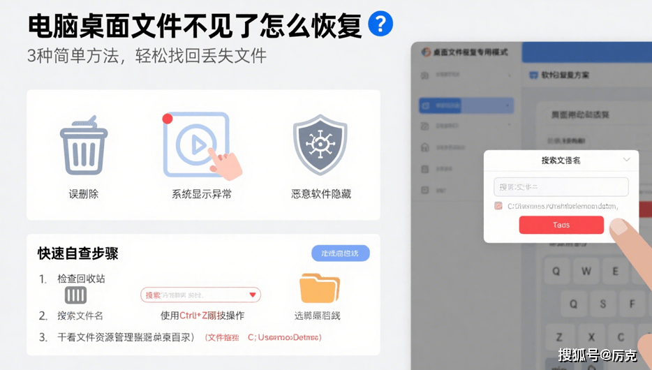 早上打开电脑,桌面的待办事项清单突然消失;整理桌面时误拖文件到回收站,清空后才发现是重要的项目方案;电脑更新系统后,桌面图标大面积缺失,常用软件快捷方式和文档全不见;甚至安装新软件后,桌面文件夹被自动隐藏,搜索也找不到踪迹…… 作为电脑使用频率最高的区域,桌面承载着临时文档、快捷方式、待办资料等关键数据,当 “电脑桌面文件不见了”,不仅影响办公效率,还可能因重要资料丢失造成损失。很多人此时会手足无措,其实像解决电脑数据恢复有专属方案一样,桌面文件丢失多因路径变更、误操作或系统设置导致,通过针对性方法就能快速找回,关键是先判断丢失原因,再选对恢复方式。