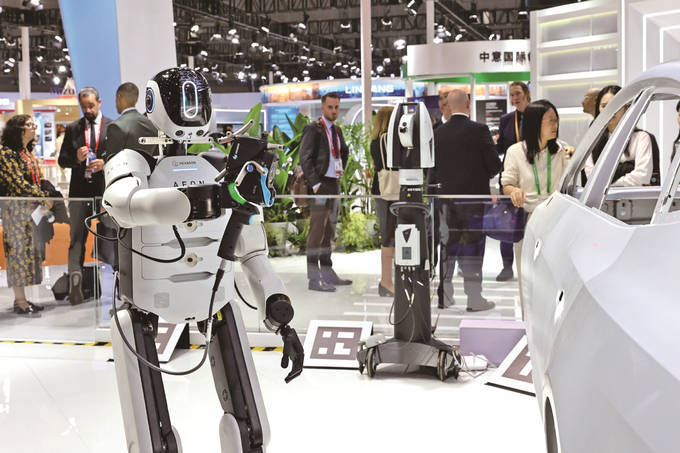 11月5日,一个海克斯康AEON工业人形机器人在展台上进行三维扫描作业演示,这也是该型号机器人工业自动化应用场景的中国首展。新华社发