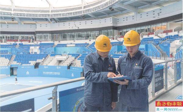 十五运开幕临近,南方电网广东珠海供电局保电人员对网球赛事场馆的用电设备进行检查,全力保障赛事期间的电力供应稳定可靠。