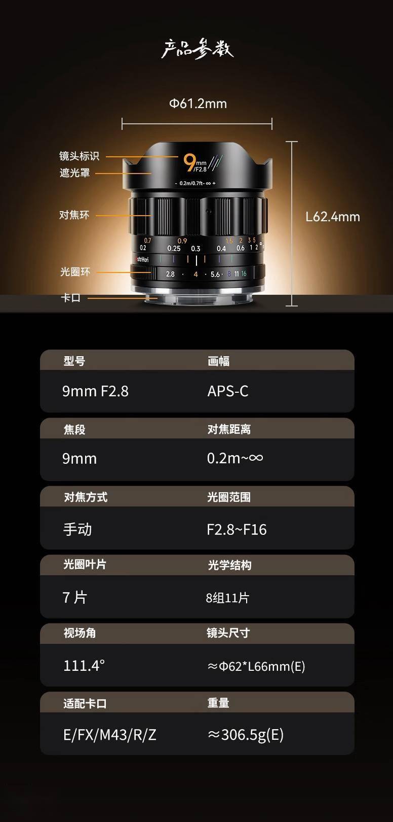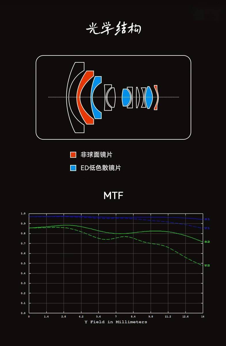 规格方面,该镜头最近对焦距离是 0.2 米,重约 306.5 克。采用 8 组 11 片设计,提供手动对焦,匹配 7 片光圈叶片。