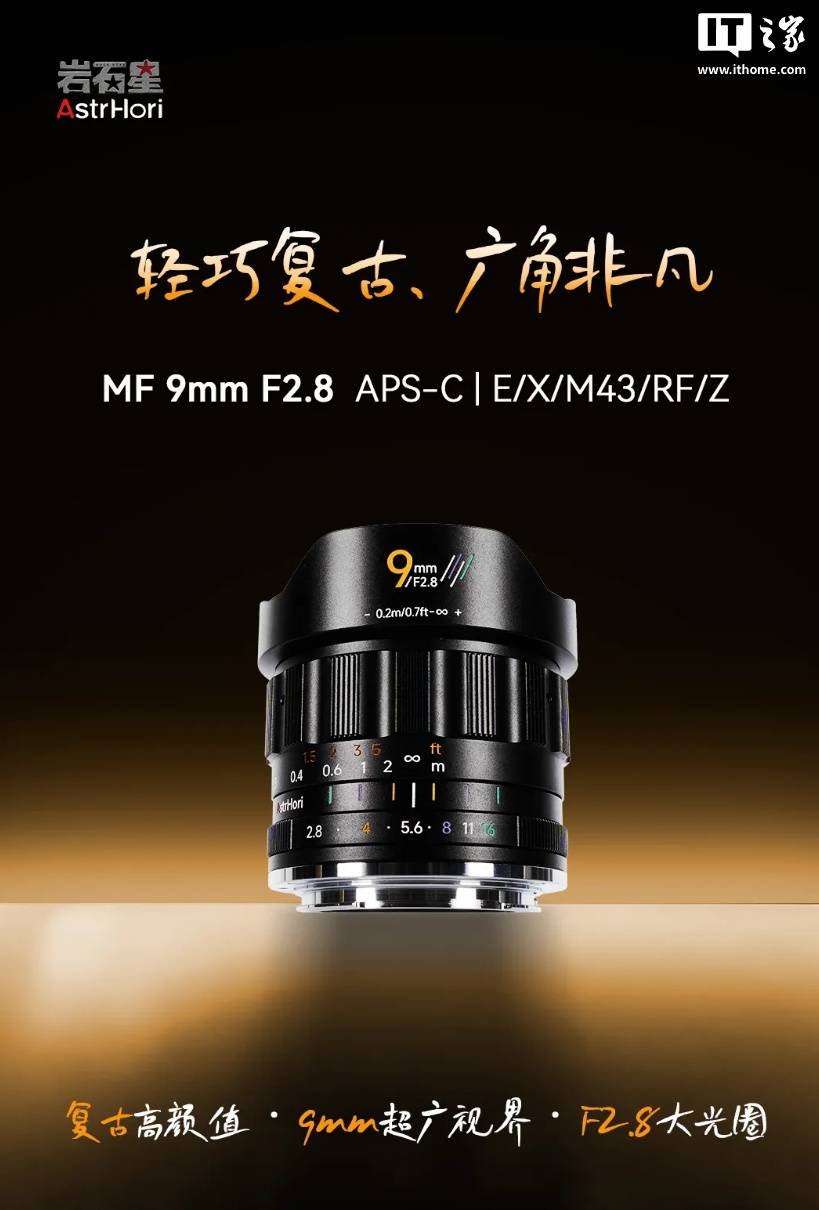 IT之家 11 月 7 日消息,岩石星 MF 9mm f/2.8 半画幅超广角镜头现已正式上市,主打轻巧设计,提供索尼 E / 佳能 RF-S / 尼康 Z / 富士 X / M43 卡口,定价 879 元,首发价 828.85 元。