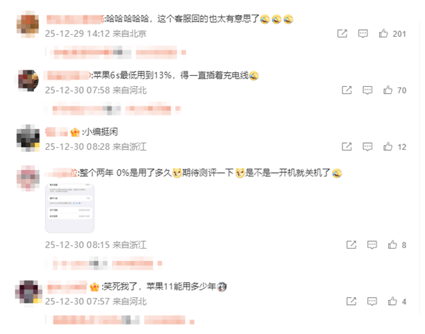 有网友表示,自己的iPhone 6s电池最低曾用到仅剩13%,此后手机不得不全程连接充电线才能使用。还有用户晒出使用两年期间的电池循环记录,对这类电池的实际续航表现感到好奇,并期待能有相关测评。