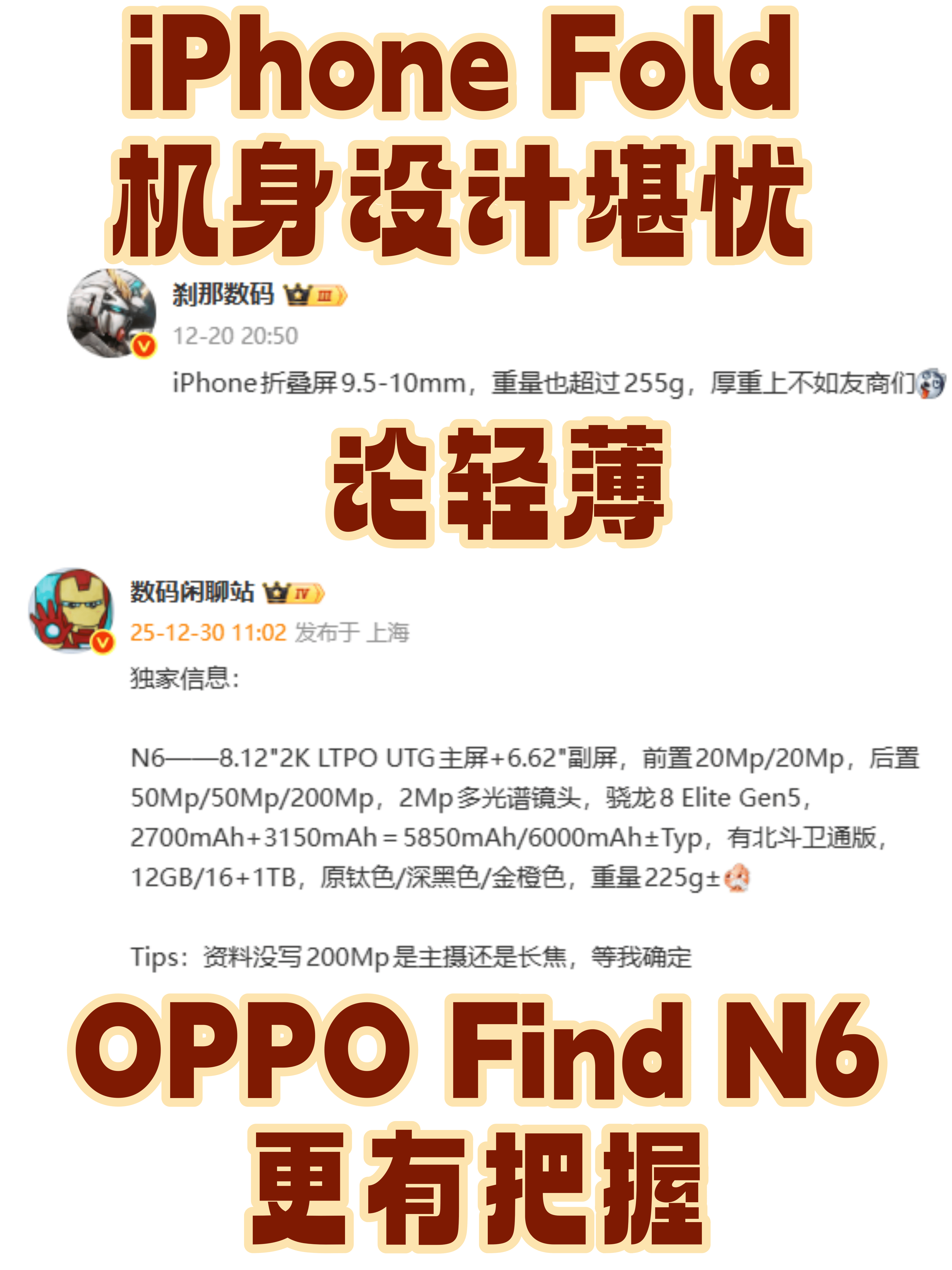 不得不说我觉得至少从现在的爆料信息来看,OPPO Find N6比iPhone Fold更有看点,接下来就等看两台机型的真机表现了~