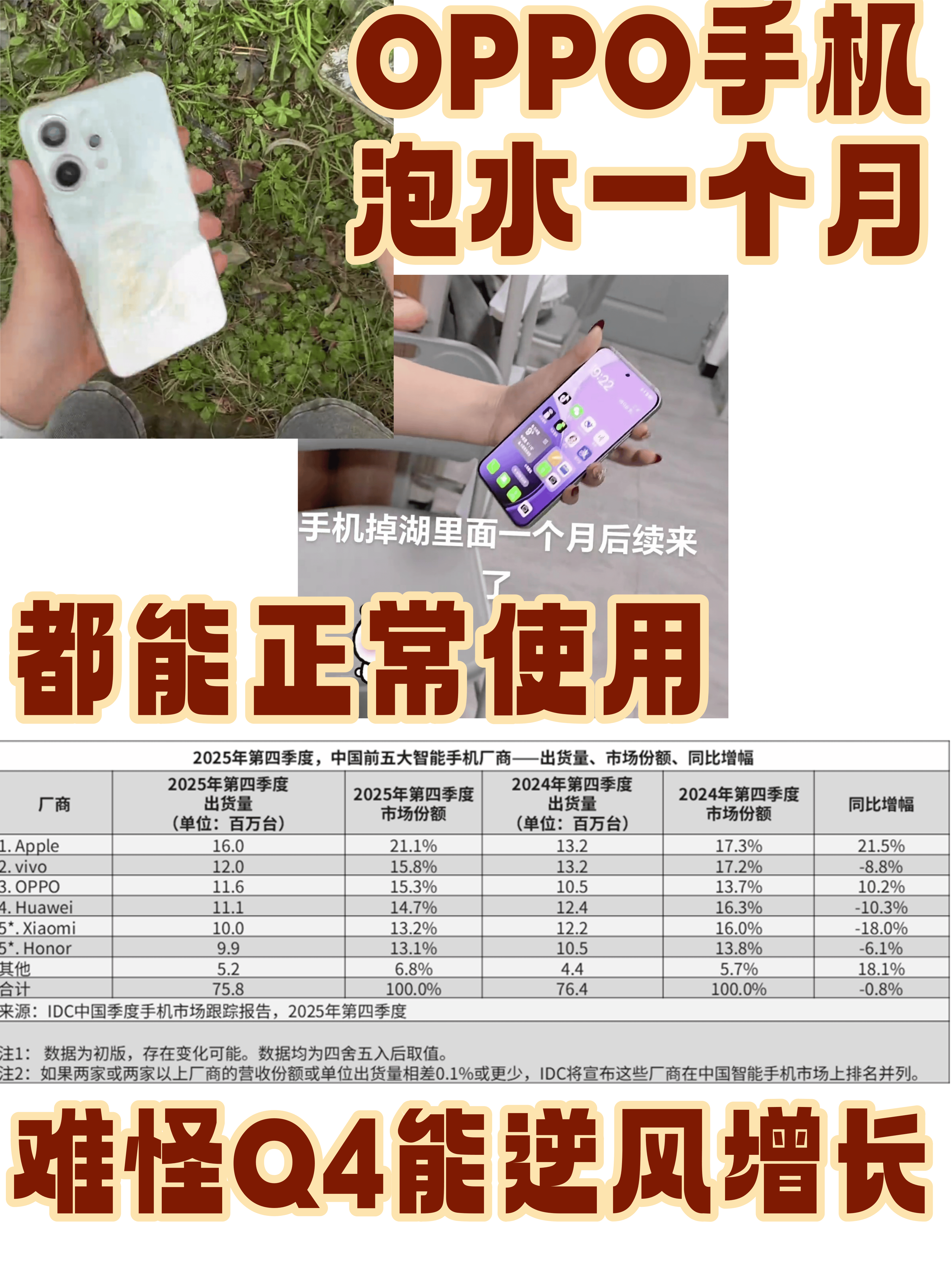 另外,这几天还看到了个比较有趣的视频,说OPPO手机在湖水里泡了一个月再打捞出来也能正常使用。说实话我觉得OPPO能在2025年第四季度成为国内市场唯二逆风增长的品牌,也少不了手机质量的支持,毕竟之前就是传奇耐摔王了,现在更是传奇耐泡王......讲真这种防水能力要是放在OPPO Find N6上,那这耐用度直接起飞了好吧!