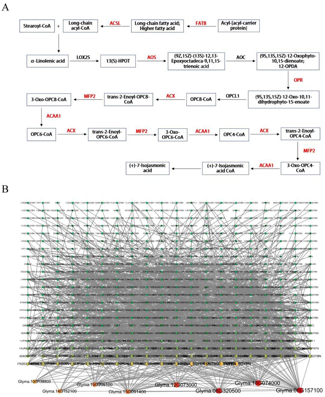 - 图为 (A) 植物中JA的生物合成途径。在茉莉酸生物合成途径中富集的基因,用红色标记。(B) 绿松石模块枢纽基因的共表达网络分析。