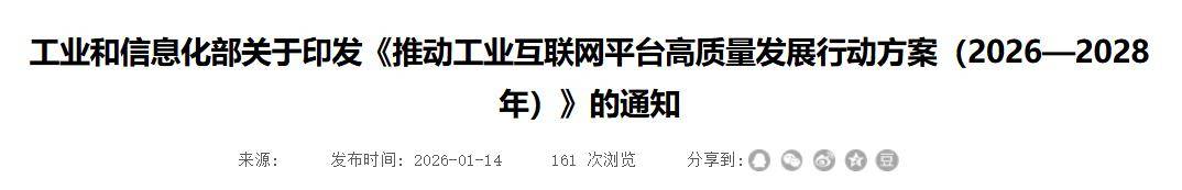 1月13日,工信部正式印发《推动工业互联网平台高质量发展行动方案(2026-2028年)》。