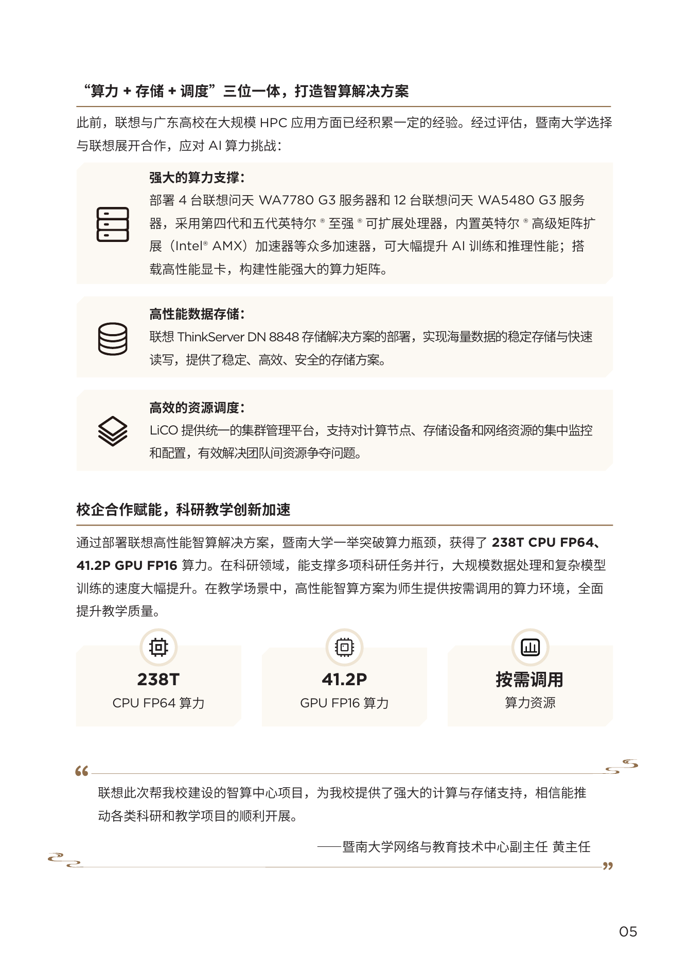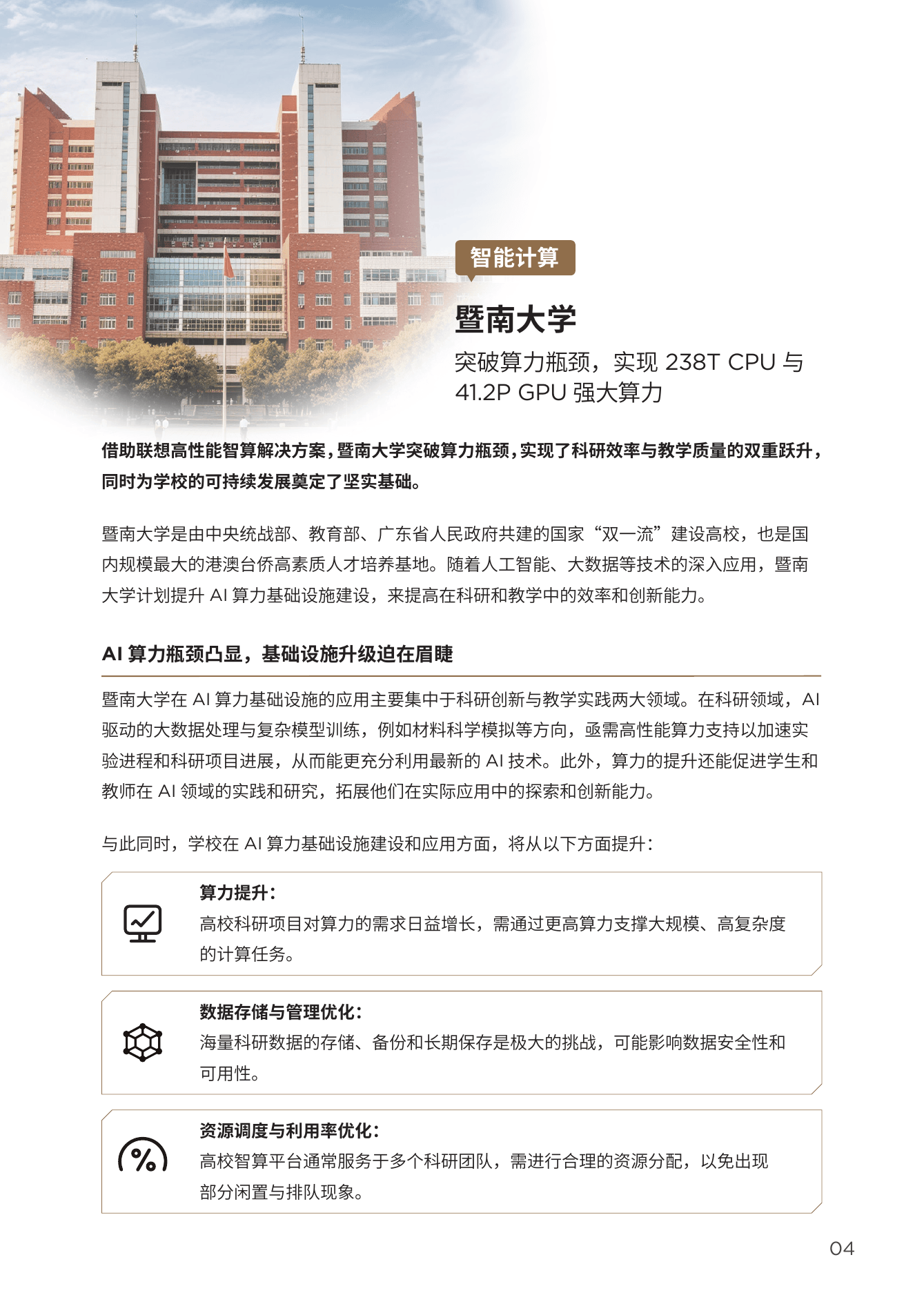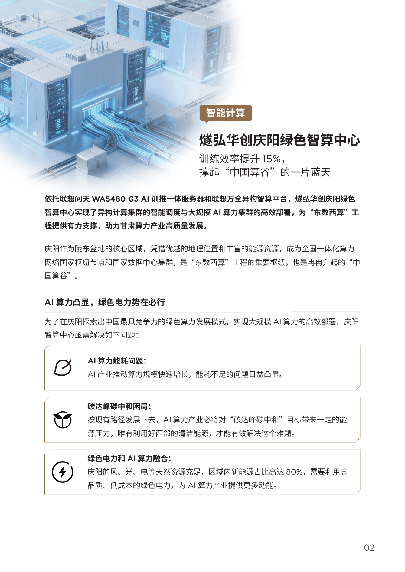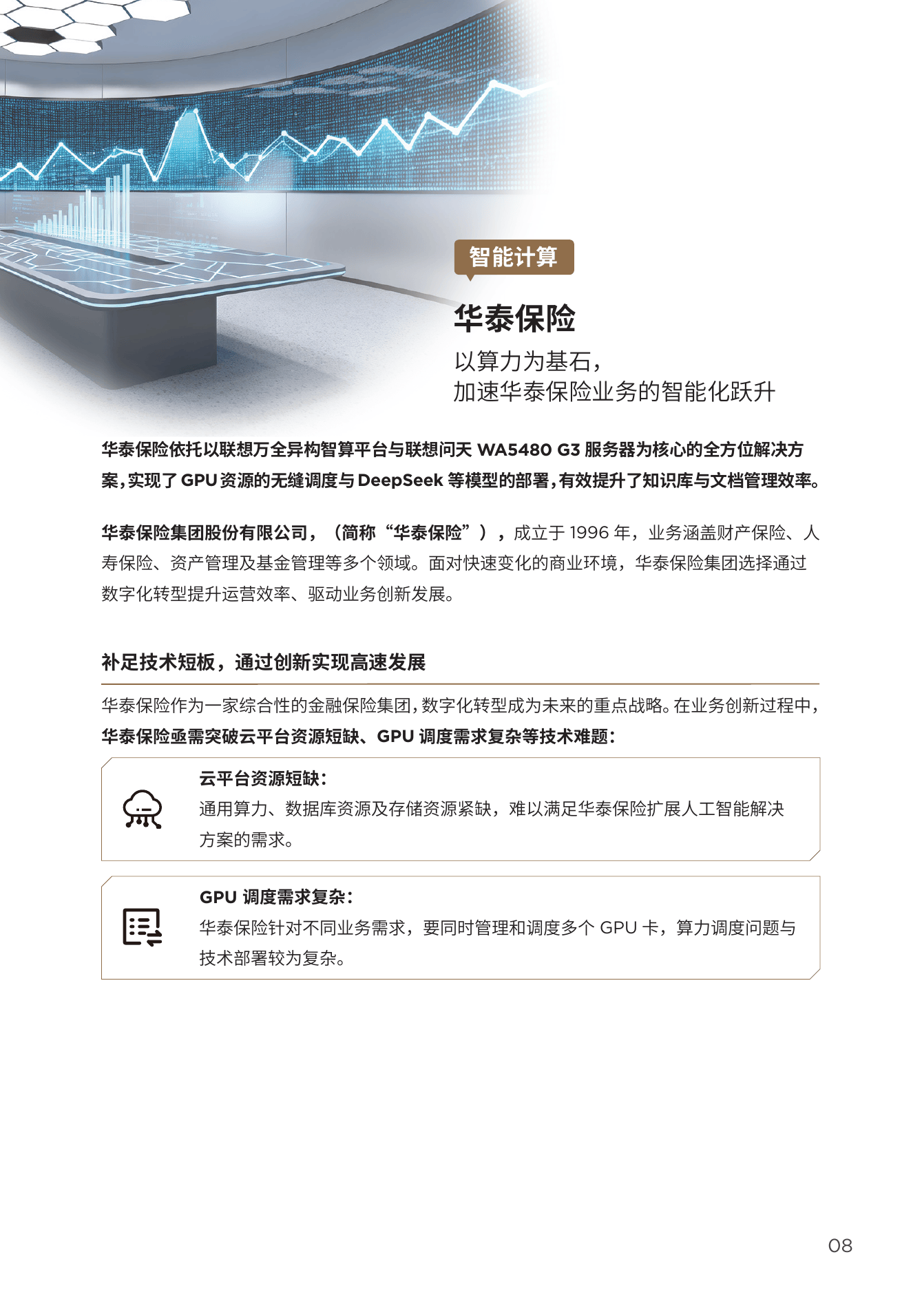 联想致力于帮助各行各业打破效率瓶颈、优化流程,甚至孵化新的商业模式。通过多个案例可以看到,不同领域的企业借助联想的解决方案实现了显著提升:例如,燧弘与联想共建庆阳算力中心,助力“中国算谷”发展;暨南大学构建“算力-存储-调度”一体化智算方案,破解科研教学算力困局;华泰保险通过联想GPU异构方案提升管理效率和系统稳定性;南京市第一医院通过软件定义基础设施实现双院区服务高效协同。