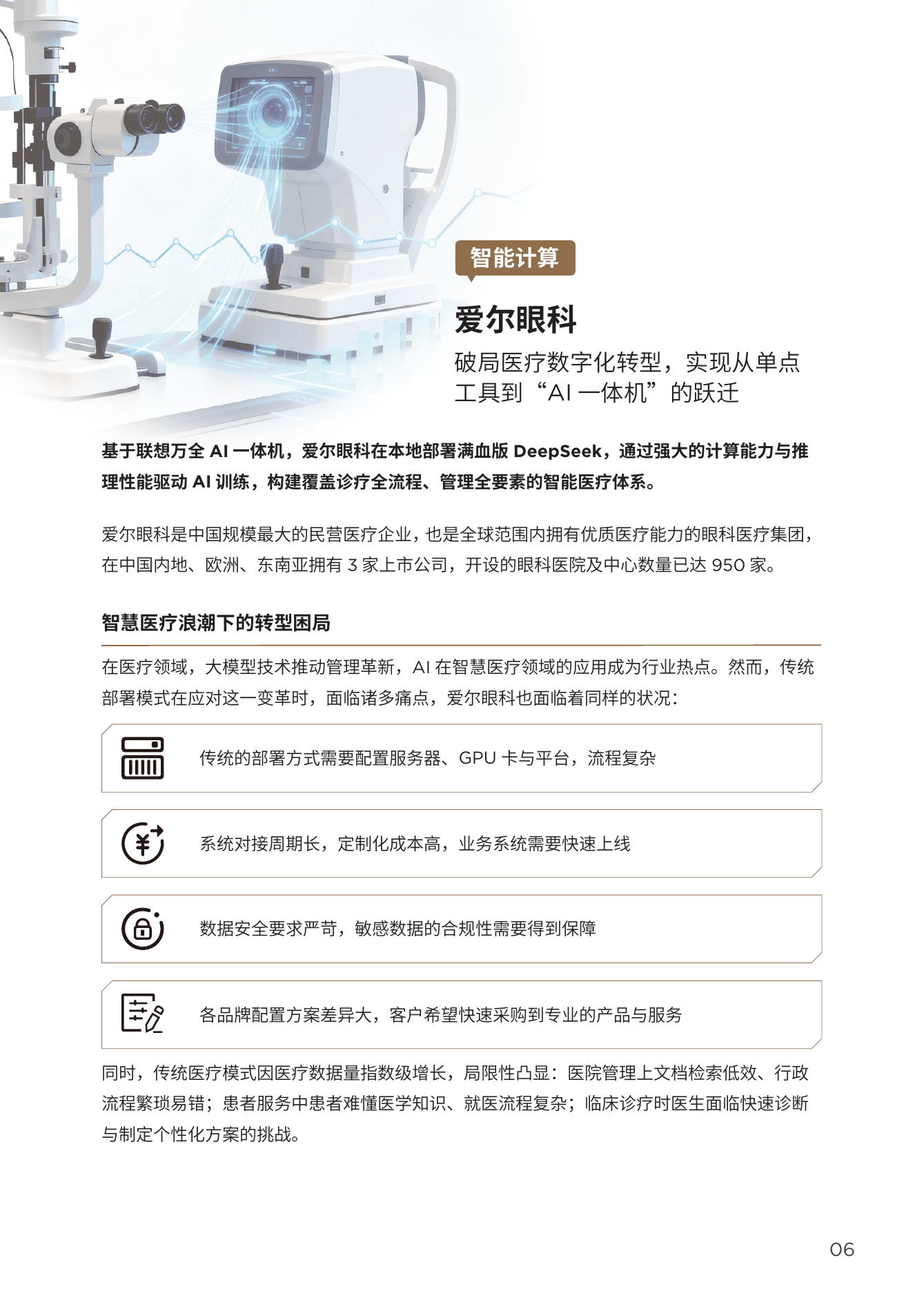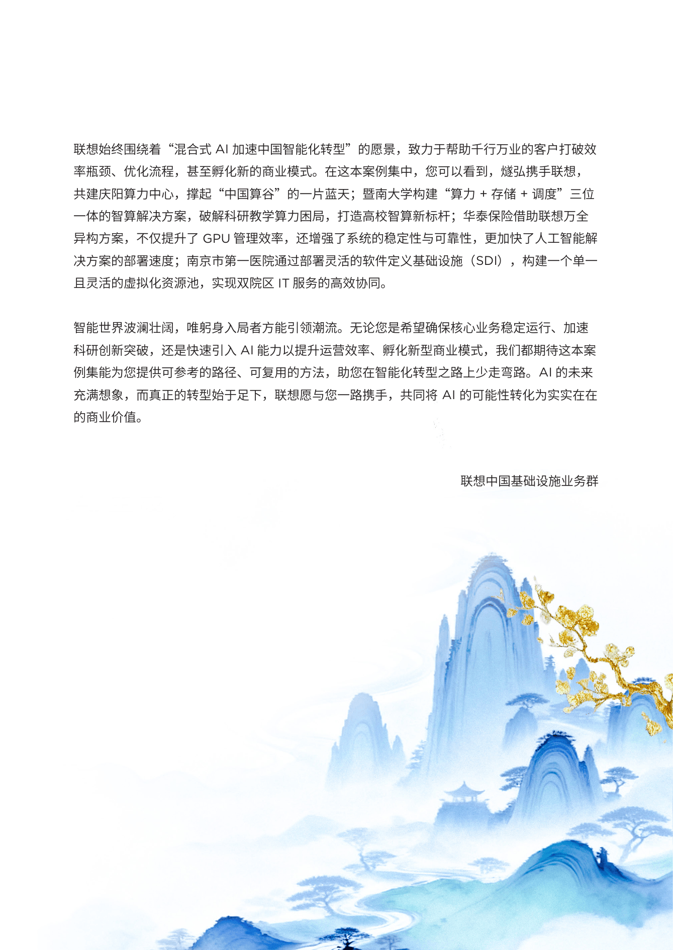 这些实践表明,无论是在保障核心业务运行、加速科研创新,还是引入AI能力提升运营效率、孵化新商业模式方面,算力都扮演着基础性角色。通过这些案例,可以获取可参考的路径和方法,助力企业在智能化转型之路上少走弯路。未来充满可能,而真正的转型始于脚下的每一步。联想愿与各方携手,将可能性转化为实际的商业价值。
