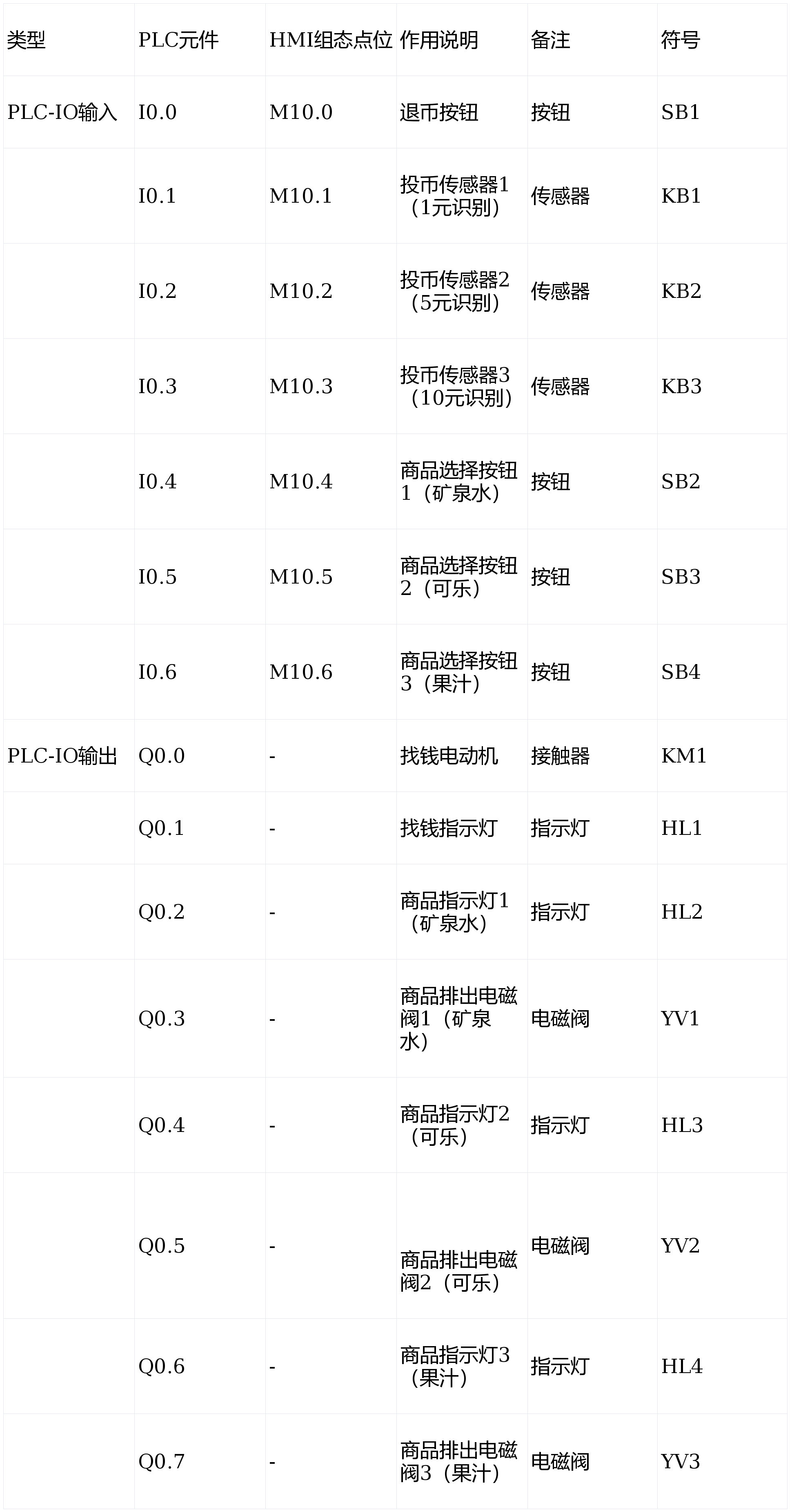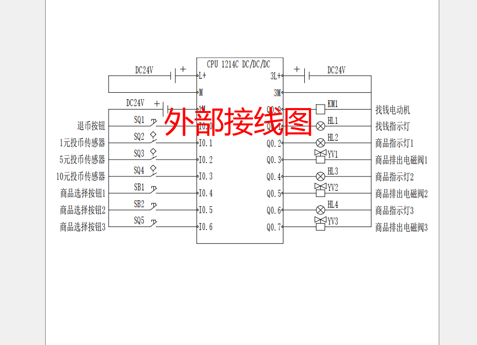 - 输出设备:找钱电动机(KM1)、指示灯(HL1/HL2/HL3/HL4)、商品排出电磁阀(YV1/YV2/YV3),说明选型参数与控制要求匹配性。